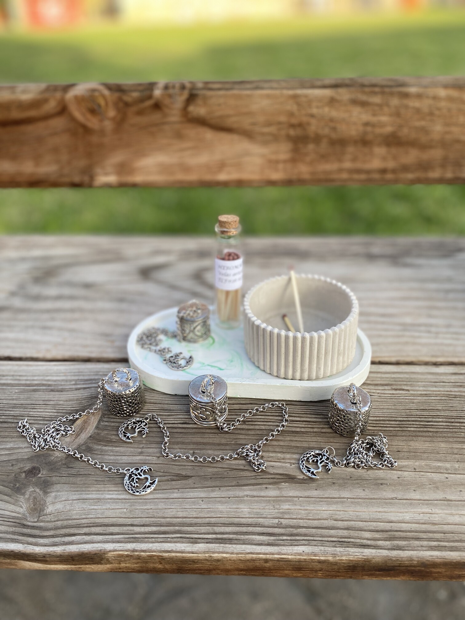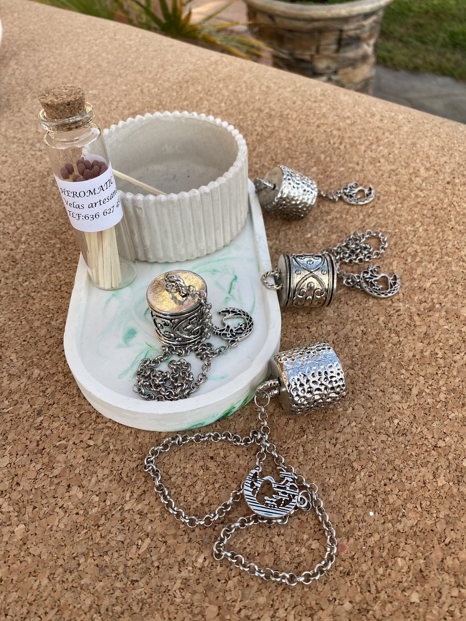 Apagavelas metalico realizado a mano con cadena de acero inoxidable y finalizado con una media luna y arbol de la vida