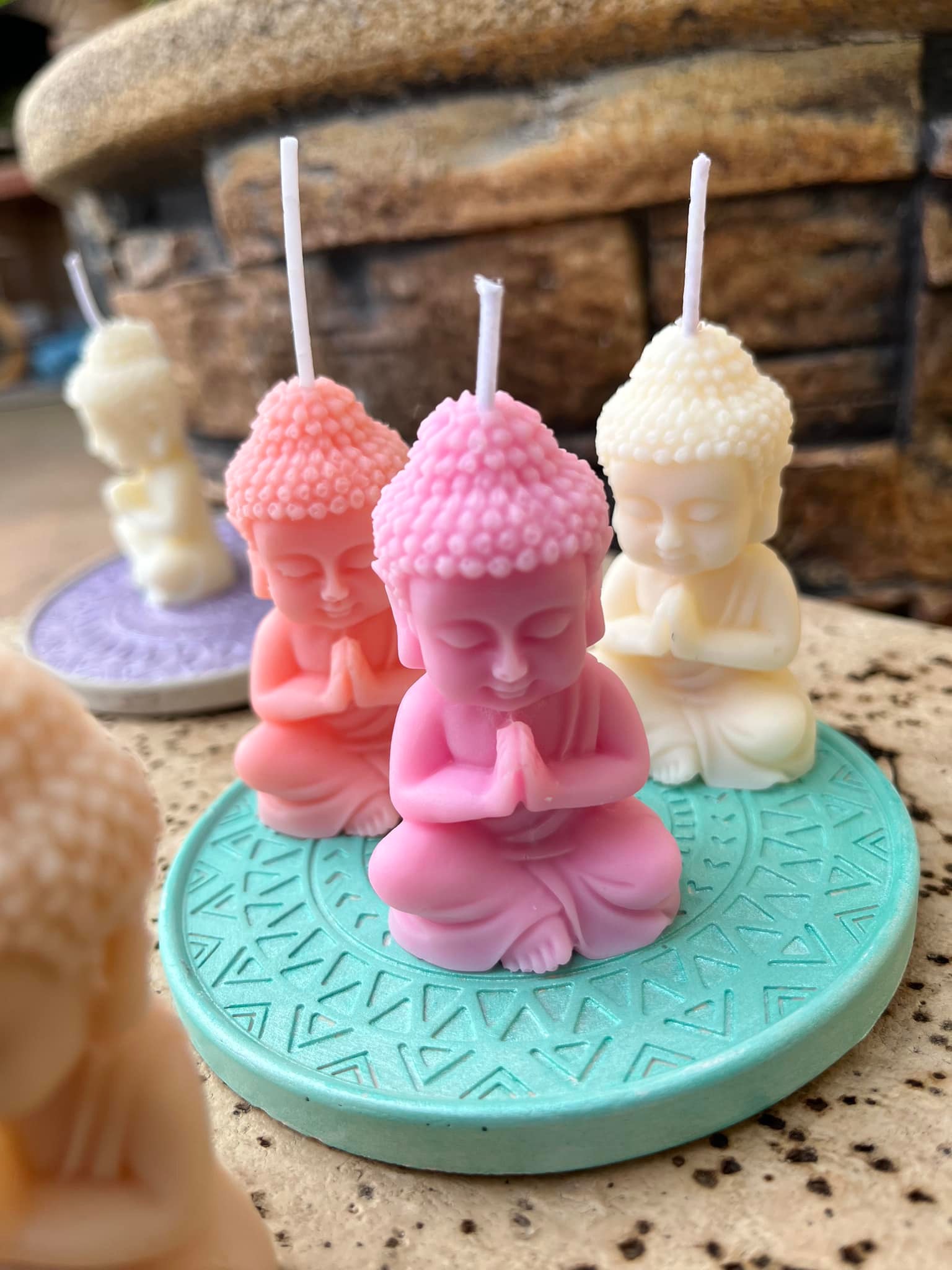 Vela decorativa realizada en cera de soja con mecha de algodón en forma de buda.Aroma palo santo
