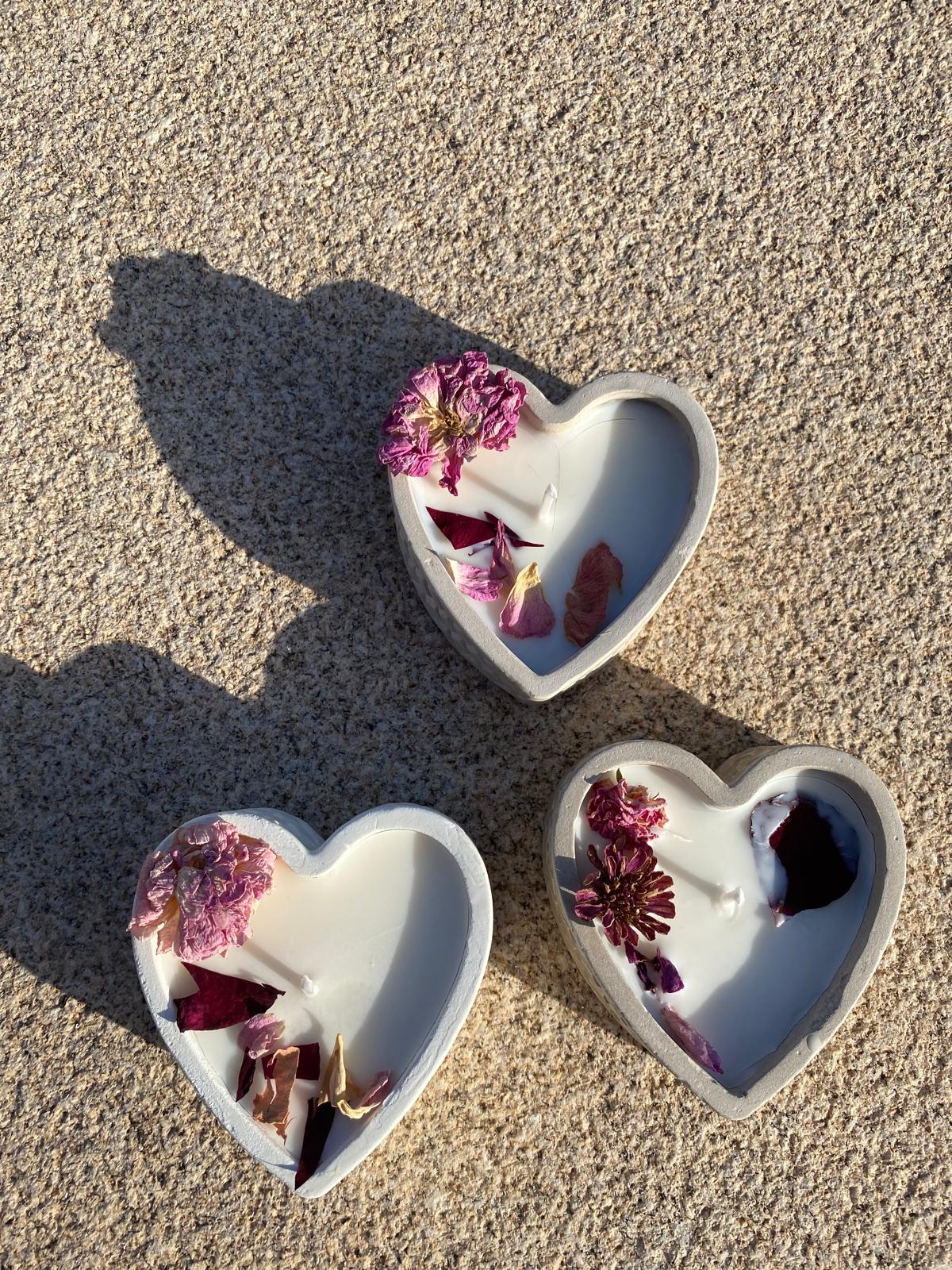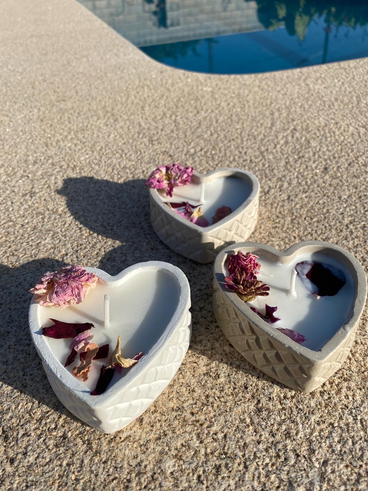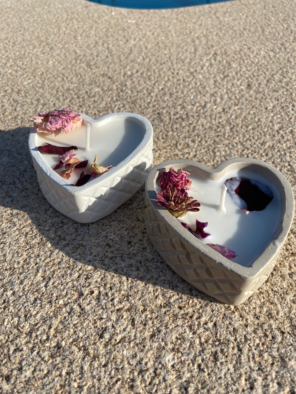 Envase de cemento hecho a mano, con forma de corazón relleno con 75g de cera de soja con aroma amaderado acabado con flores secas naturales
