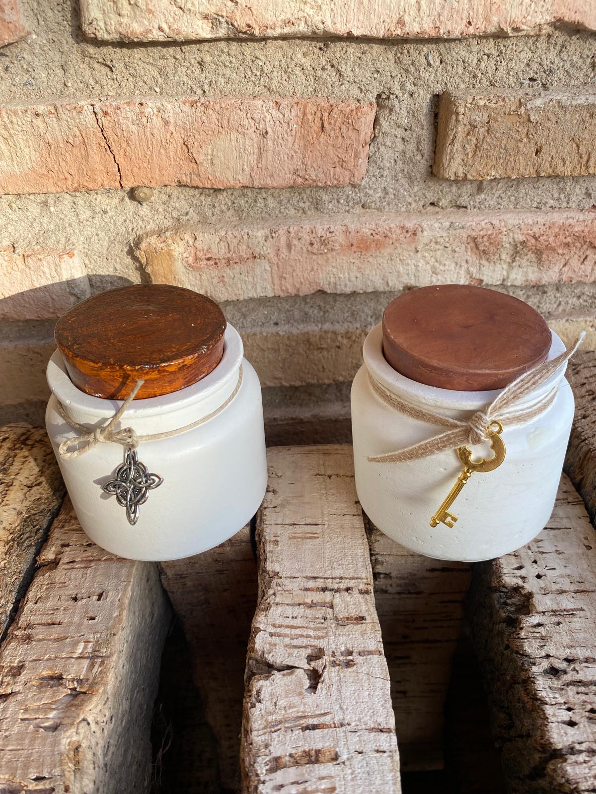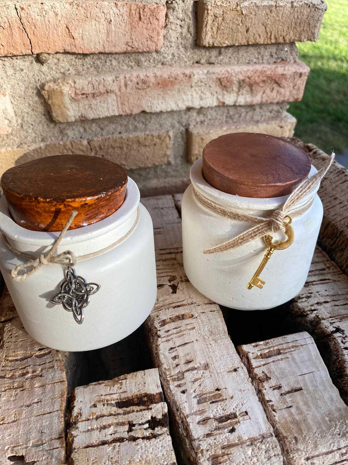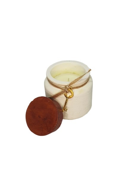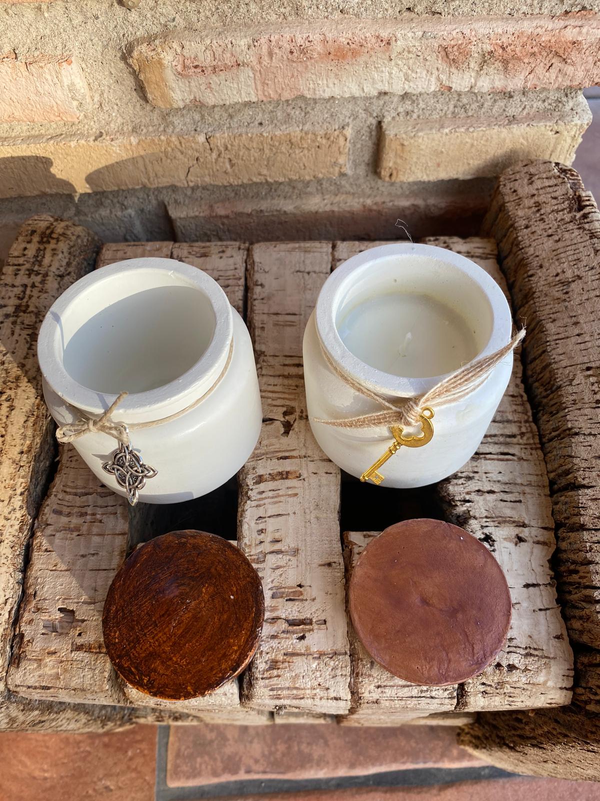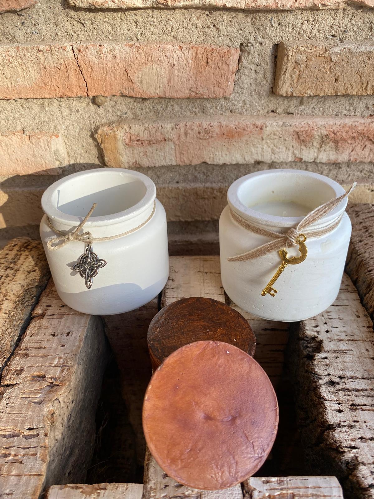 Envase cemento hecho a mano con forma de tarro con tapón. En su interior de cera de soja con aroma de miel, naranja y canela o café.