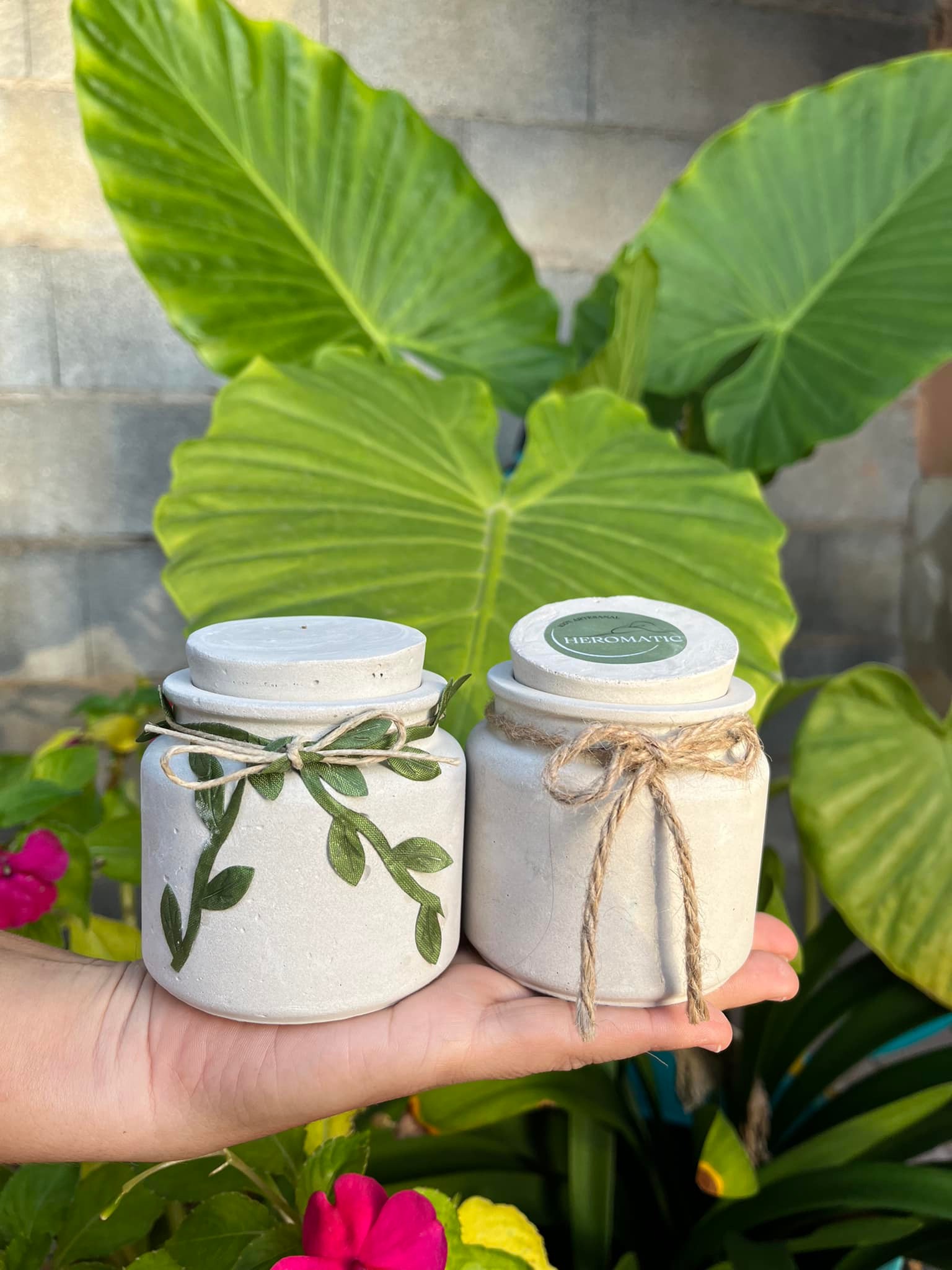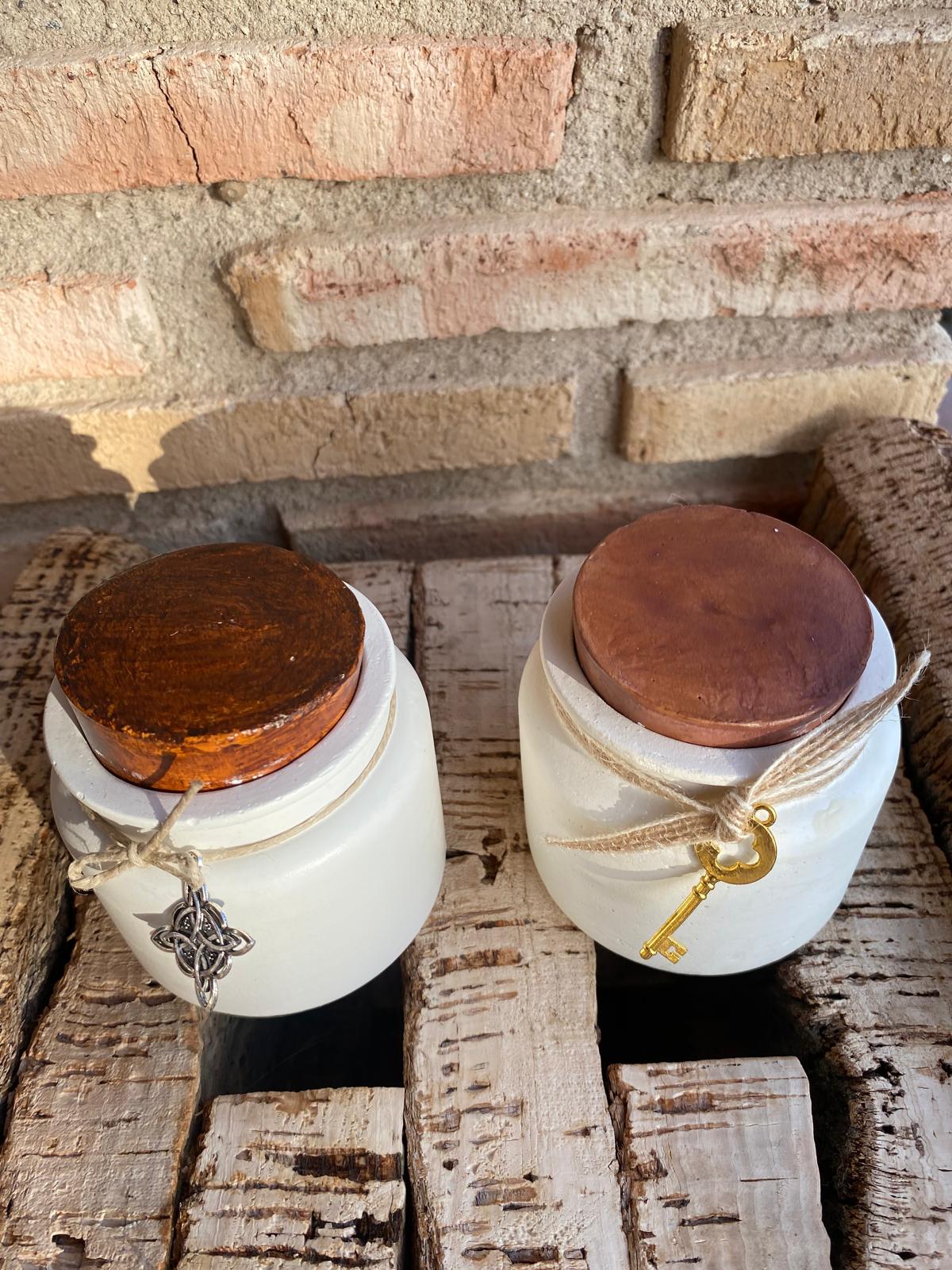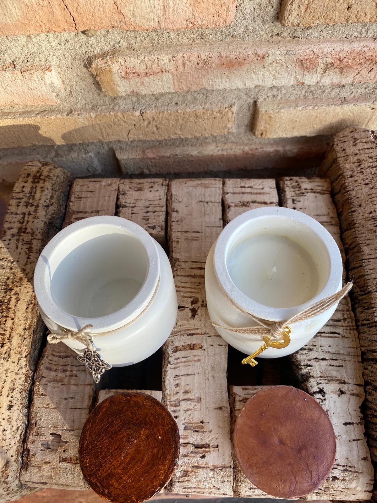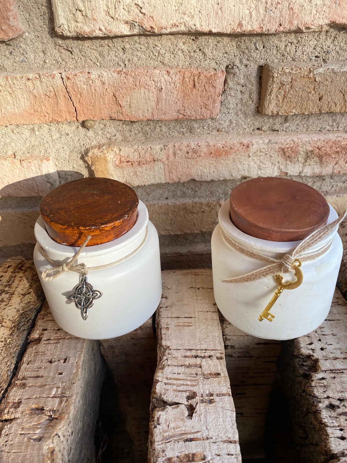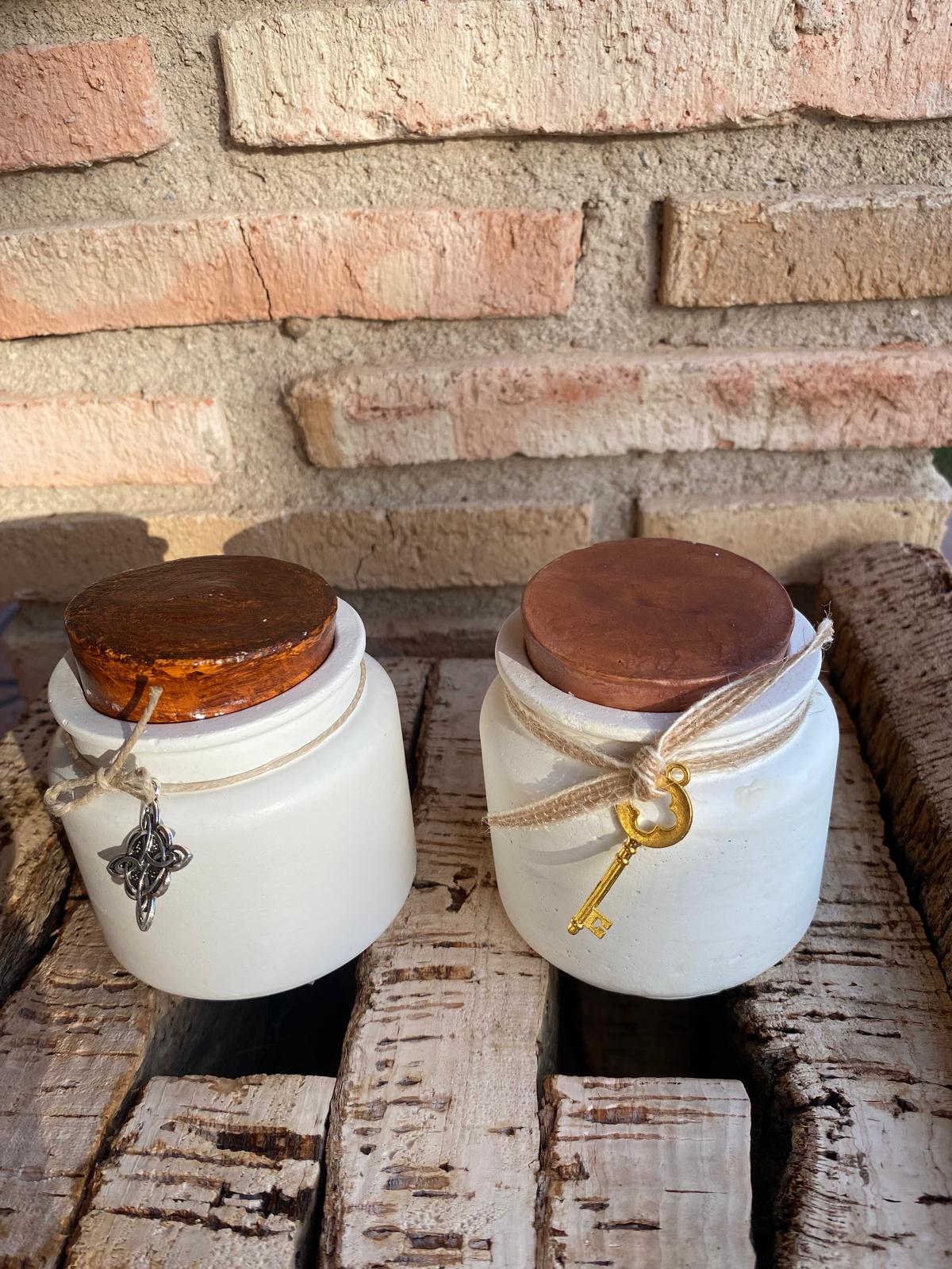 Envase cemento hecho a mano con forma de tarro con tapón. En su interior de cera de soja con aroma de miel, naranja y canela o café.
